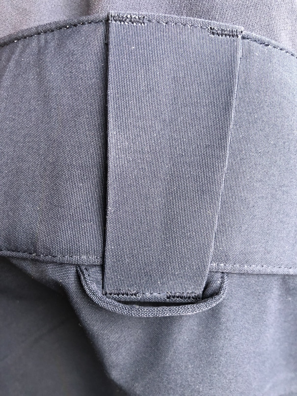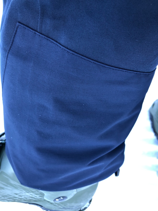 La cuisse droite possède une poche à deux compartiments, un seul aurait suffi, la séparation stretch nous a plus gêné qu’autre chose. Mais le volume de la poche est bien calibré, son contenu ne vient pas gêner la pliure du genou.