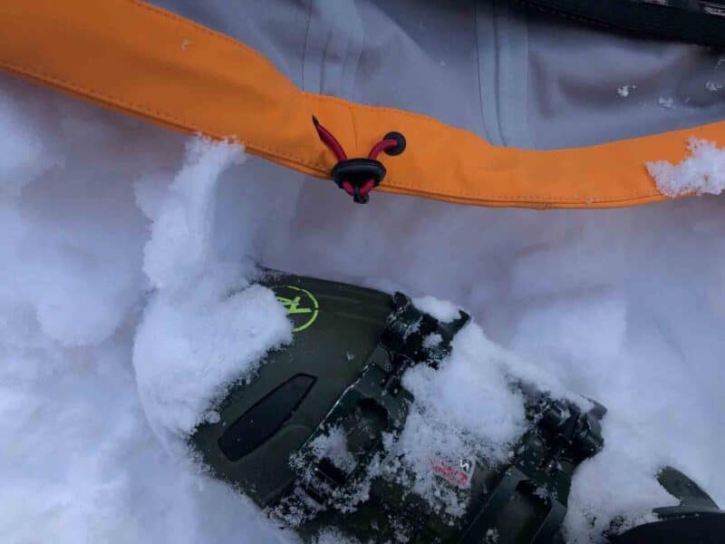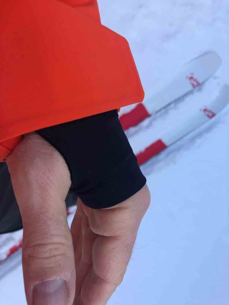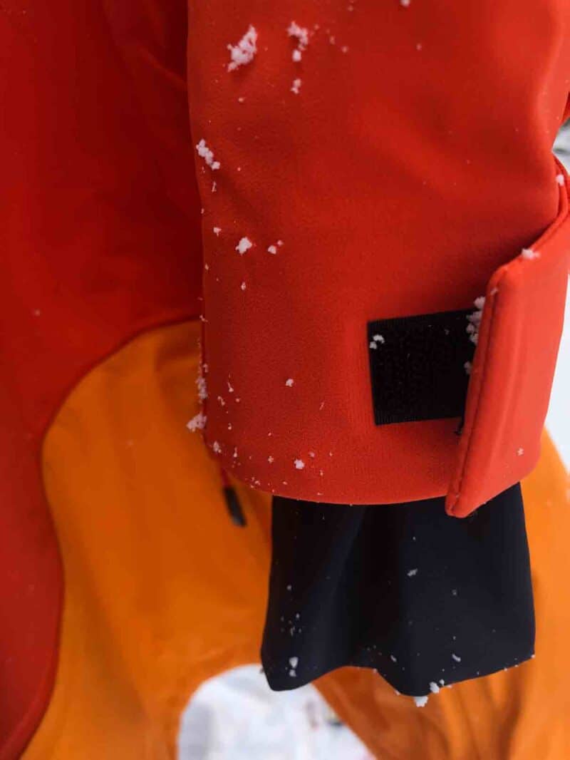 En termes d’accessoires et de fonctionnalités, rien ne manque ; réglage des poignets par velcro pour recouvrir les gants, excellente protection du cou (sans frottements), jupe pare neige non amovible (il lui manque un système pour accrocher ses extrémités si l’on ne s’en sert pas), multiples poches très pratiques. On a aimé les doubles poches inversées sur la poitrine, une conception très futée (ne pas trop les remplir sinon on obtient une certaine épaisseur en poitrine) pour bien ranger ses objets. On aime les manchettes qui protègent le dessus de la main avec un passage pour le pouce : très doux.