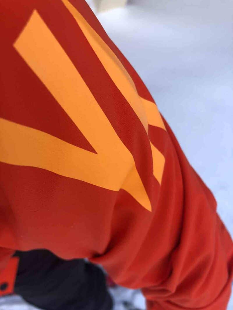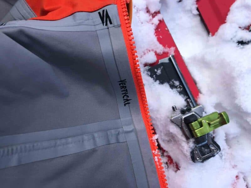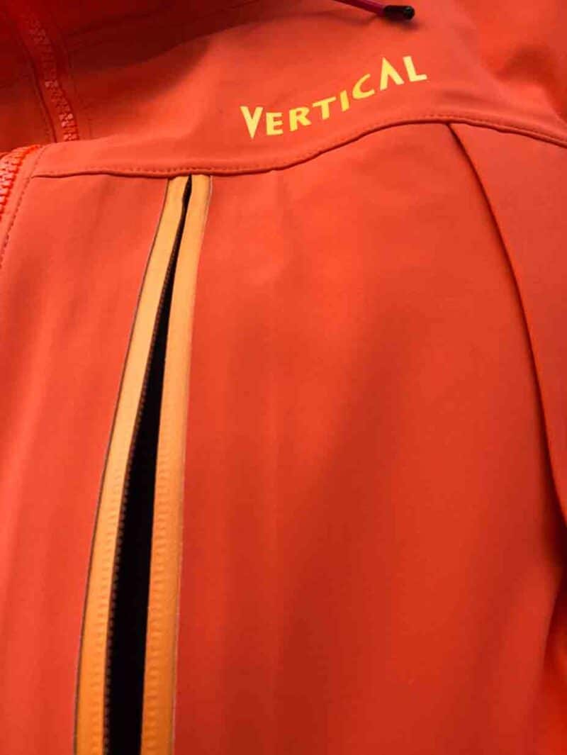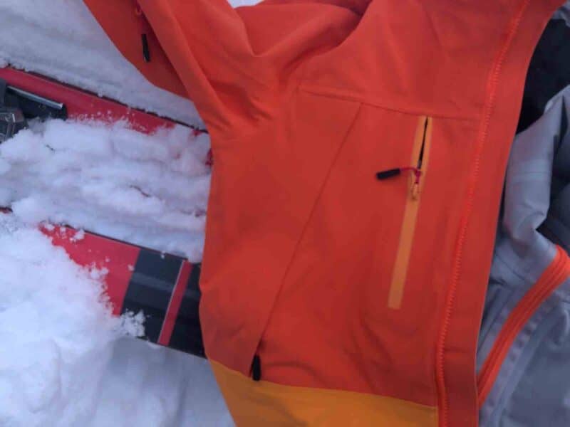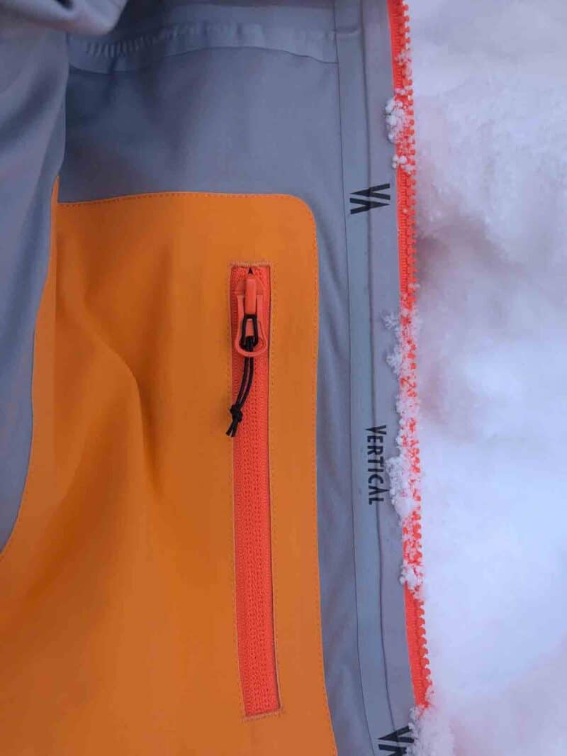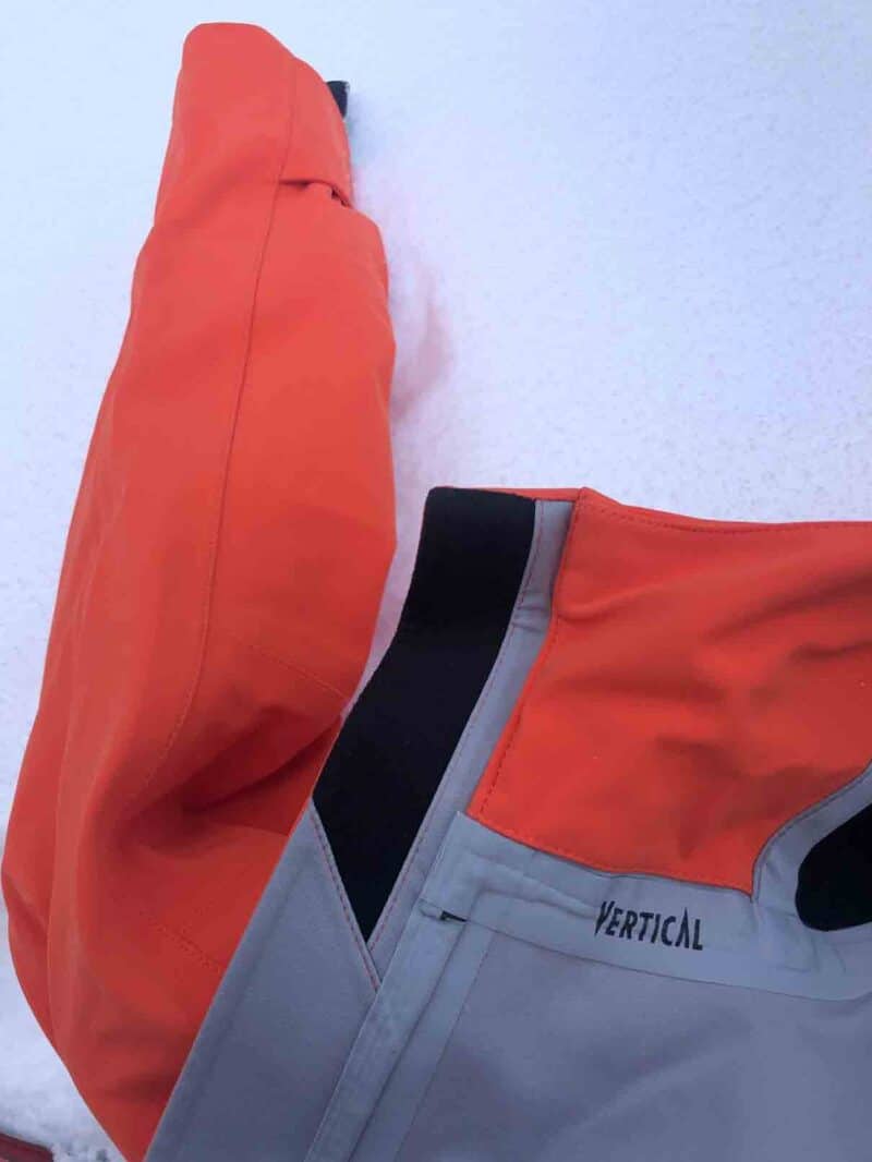 Nous avons testé l’ensemble complet Vertical Mythic MP+, veste et pantalons Vertical Mythic MP+. Première remarque, la veste est plus marquée free randonnée voire ski de piste que le pantalon qui est, lui, clairement orienté randonnée de par sa coupe très fittéee. On retrouve même sur la Vertical MP + jkt la traditionnelle poche sur l’avant-bras pour le forfait et le filet intérieur pour le masque. C’est, pour nous un produit bien placé pour le ski de piste et la free rando.