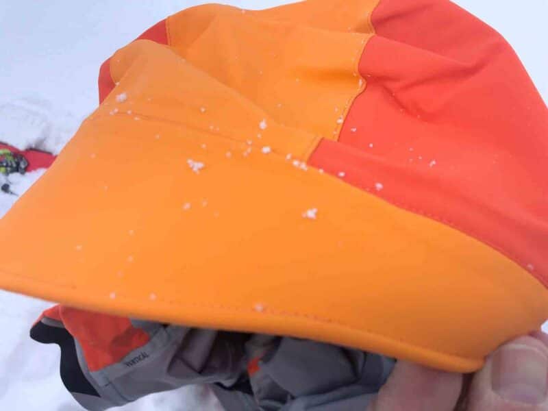 La très large capuche se règle via trop points. Les deux réglages latéraux demandent de l’attention pour être réglés. Conçue pour venir par-dessus un casque, elle protège bien latéralement et ne s’effondre pas devant les yeux au niveau de la visière.