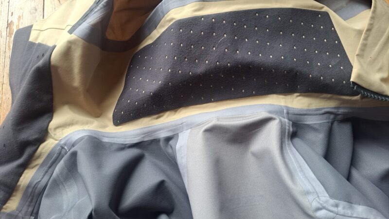 Nous avons apprécié que le col puisse monter très haut avec son petit carré de tissu intérieur agréable, collé côté nuque. De part et d’autre du rabat du zip de fermeture sur le devant de la bouche de touts petits losanges sont découpés pour favoriser (un peu) l’évacuation de l’humidité due à la respiration.